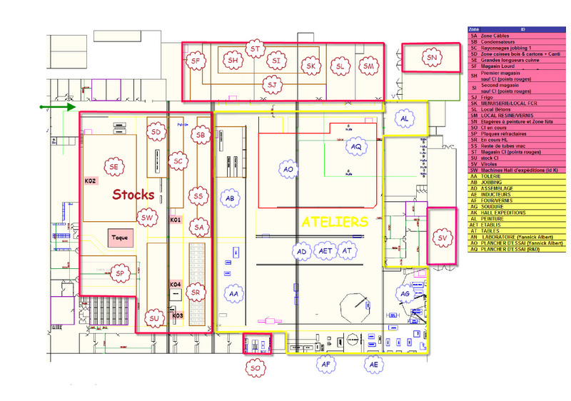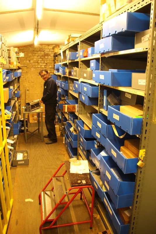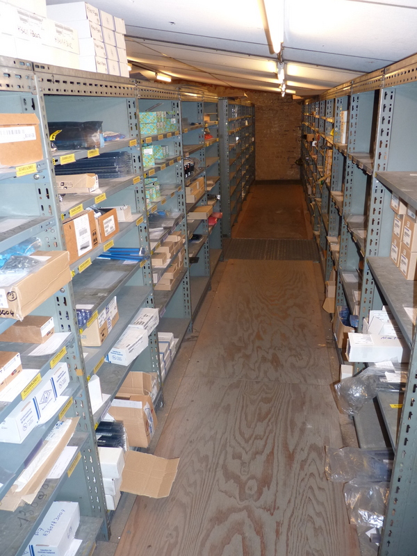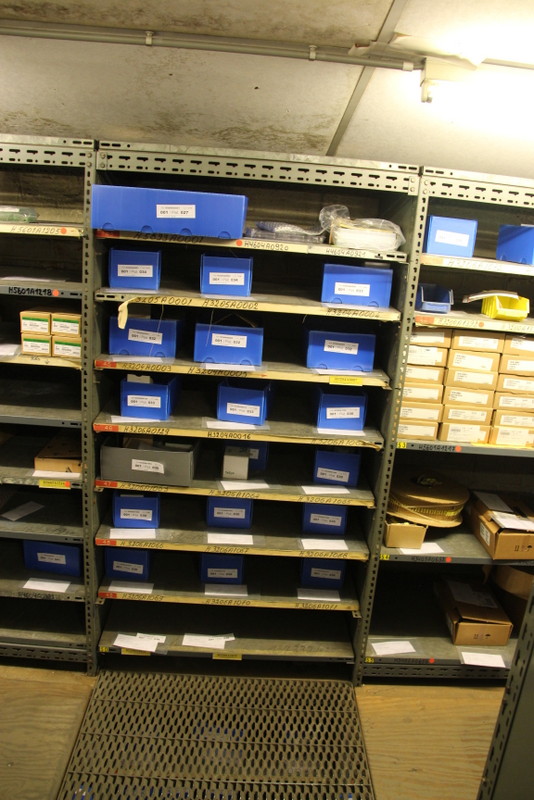 En ce qui concerne les stocks, il y avait également de nombreux tubes de cuivre, de bobines, de tôles, de pièces de toutes tailles disséminés à travers tout le site. Quant au magasin fermé, nous y avions recensé près de 2600 articles différents sans compter le matériel utilisé pour la réalisation de circuits imprimés (~700 articles différents).