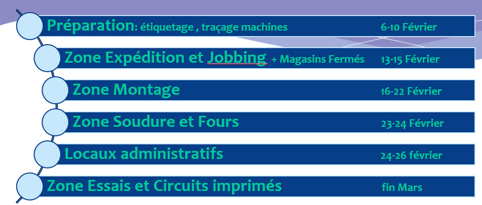 Puisque notre estimation de transfert était entre 100 et 120 semi-remorques (hors bureaux et archives), à raison de ~6 semi-remorques par jour (puisqu’il n’y a qu’une sortie et une seule entrée), il fallait compter plutôt 4 semaines. L’idée a donc été de procéder par phase et de déménager chaque département en tenant compte de leur planning de production.
